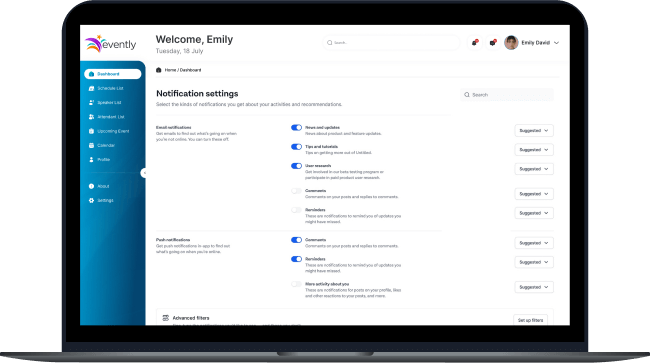 Manage push notifications sent to users and organizers, promoting featured events or platform-wide updates. Notifications can be customized based on user interests and location